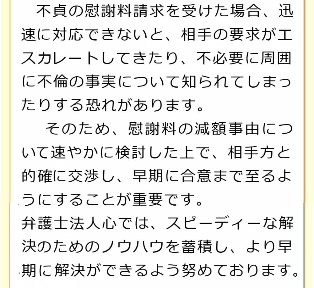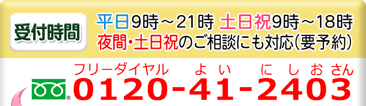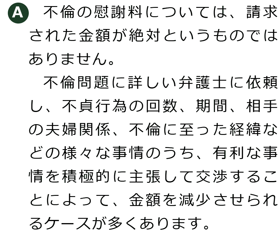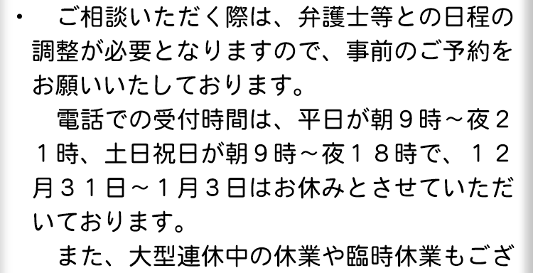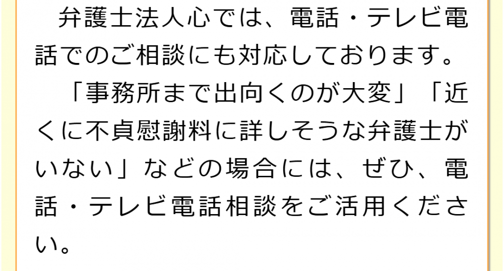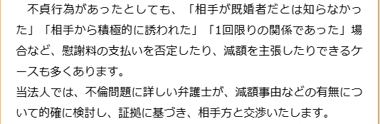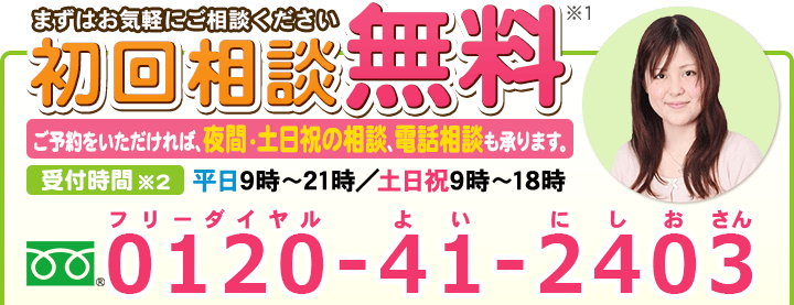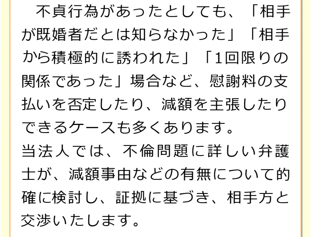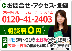不倫慰謝料請求でお困りの方へ 閉じる 閉じる よくあるご質問 お問合せから解決までの流れ 受付時間 平日 9時~21時、土日祝 9時~18時夜間・土日祝の相談も対応します(要予約) 所在地 〒111-1111 ●町●●建物● (●弁護士会●所属) 0120-41-2403 お問合せ・アクセス・地図