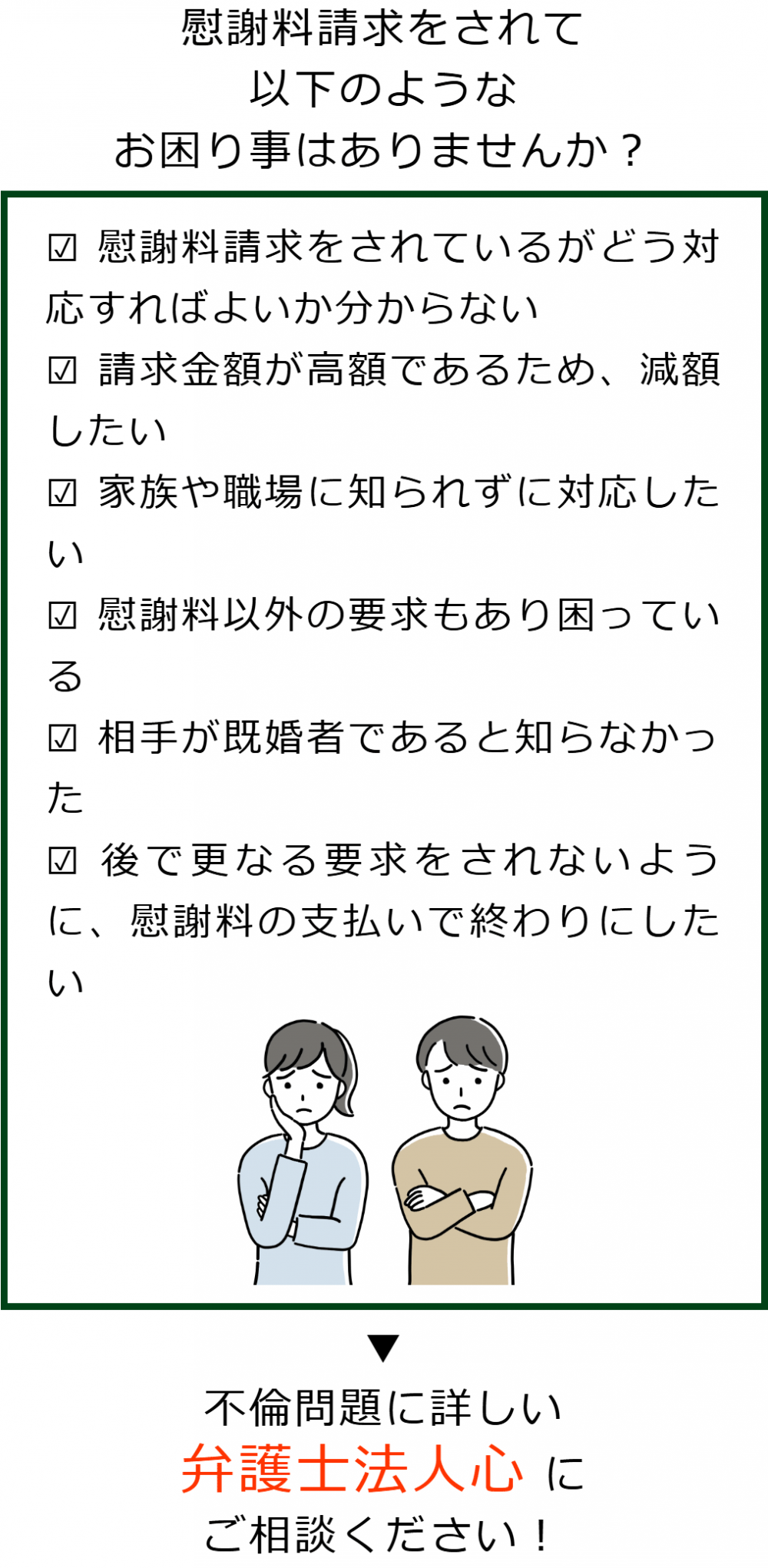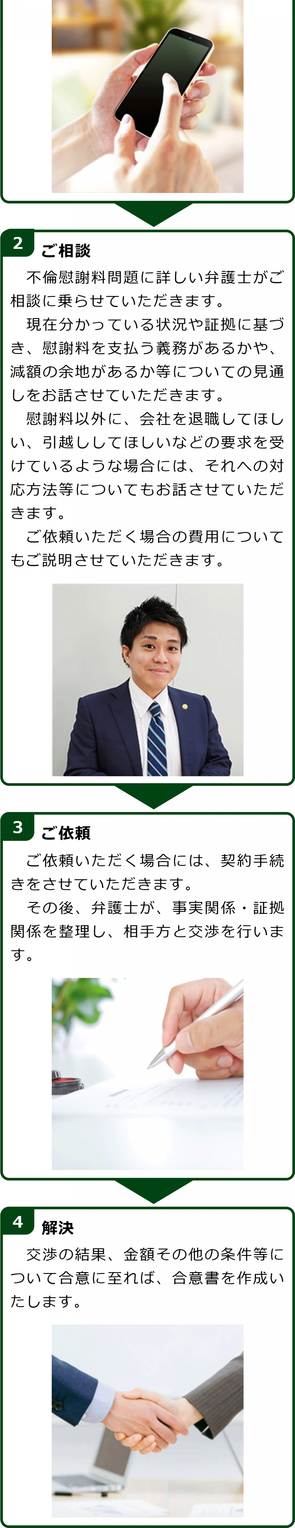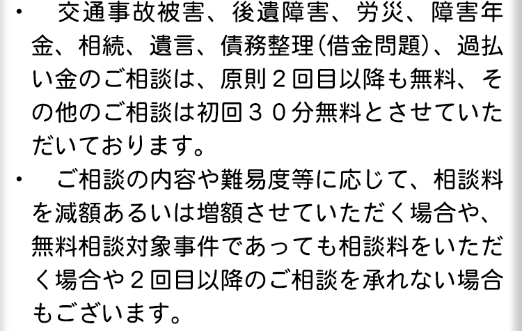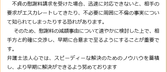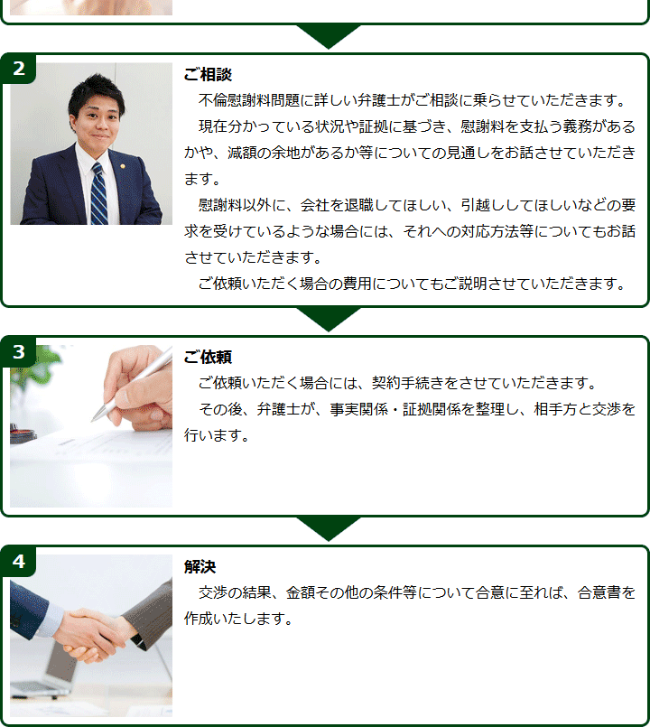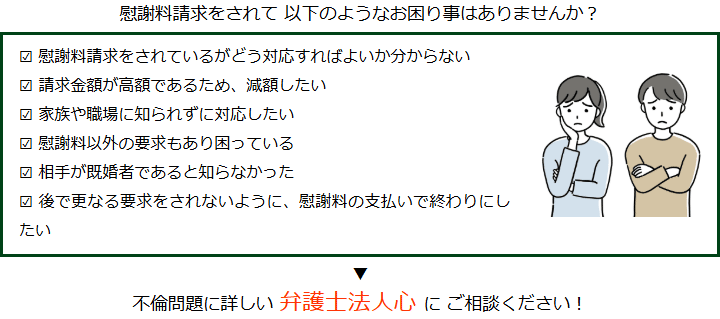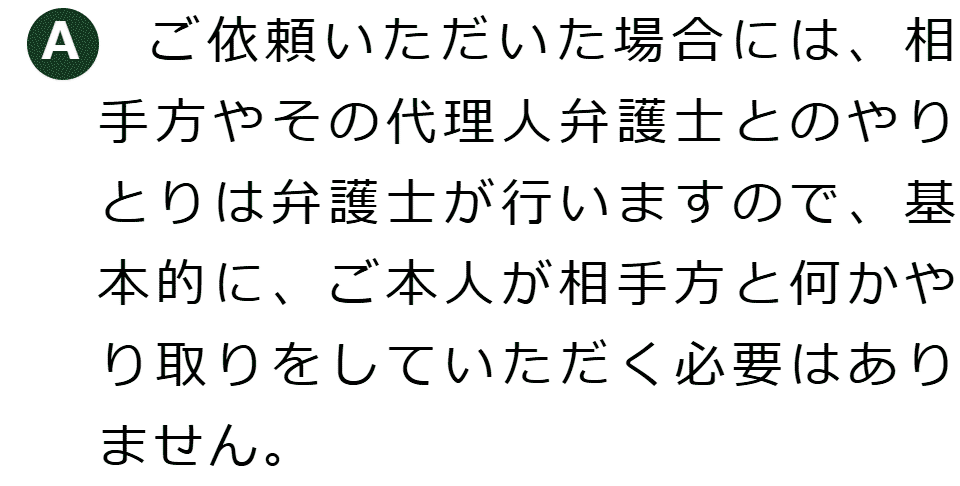 不倫慰謝料請求でお困りの方へ 閉じる 閉じる よくあるご質問 お問合せから解決までの流れ 受付時間 平日 9時~21時、土日祝 9時~18時夜間・土日祝の相談も対応します(要予約) 所在地 〒111-1111 ●町●●建物● (●弁護士会●所属) 0120-41-2403 お問合せ・アクセス・地図
