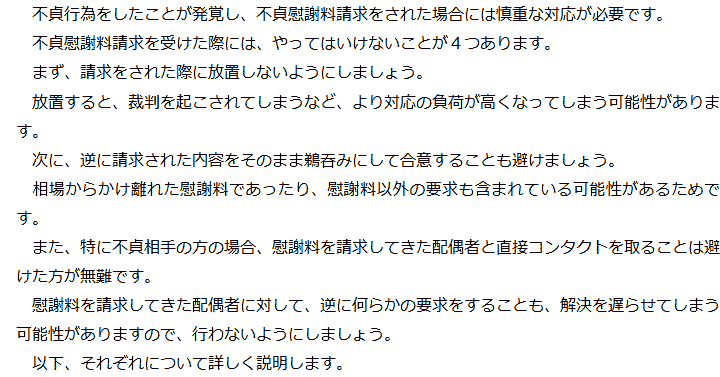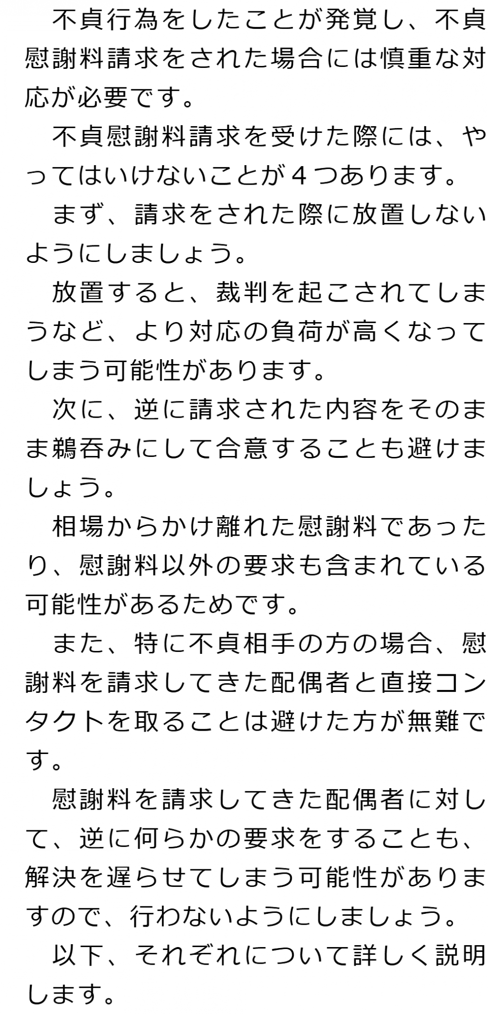 1 不貞慰謝料を請求された場合にやってはいけないことは主に4つ 2 不貞慰謝料の請求を放置すること 3 請求を鵜呑みにして合意すること 4 慰謝料を請求してきた配偶者と直接コンタクトを取ること 5 慰謝料を請求してきた配偶者に対して、逆に何らかの要求をすること