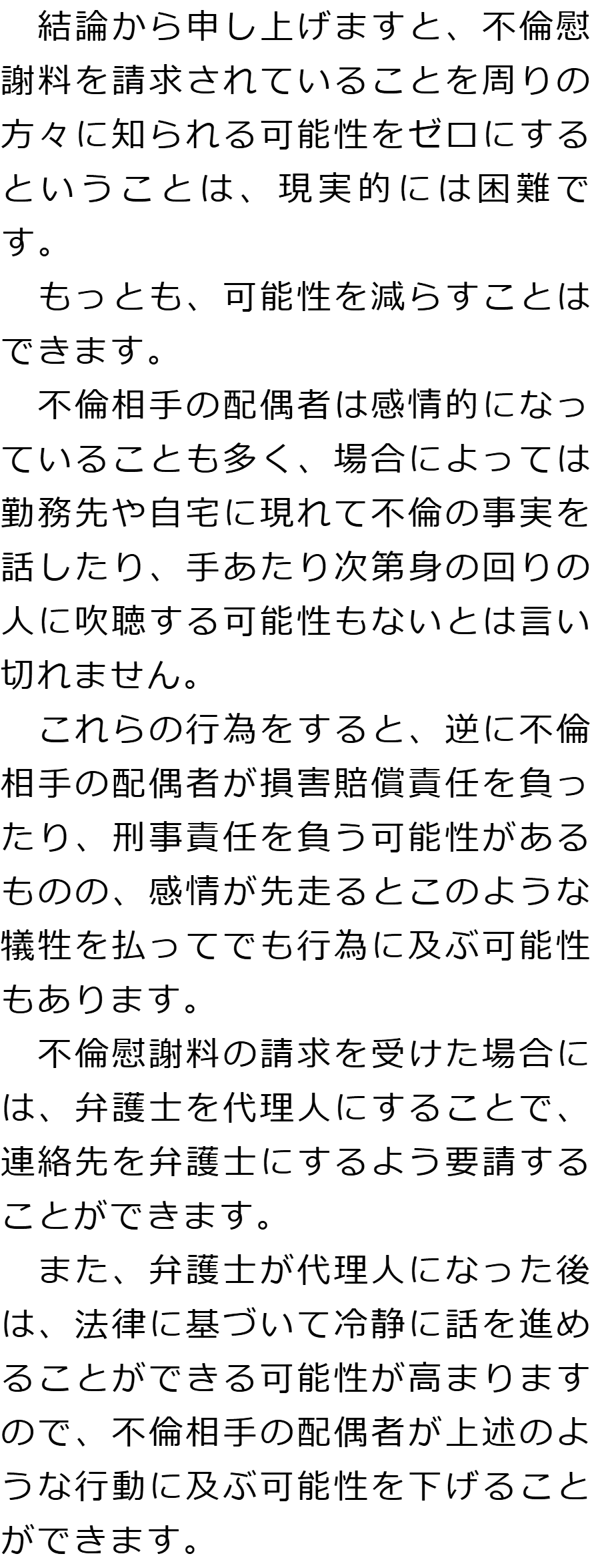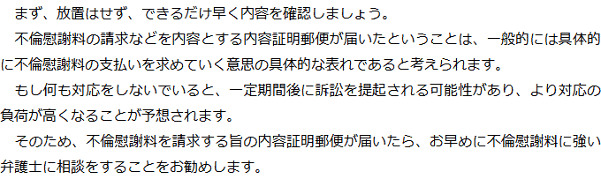Q内容証明郵便が届いたのですが、どうすればいいですか?AQ金銭以外の賠償を要求されていますが、応じなければいけないのでしょうか?AQ慰謝料を請求されていることが周囲にバレる可能性はありますか?A お役立ち情報・Q&A(目次)お役立ち情報・Q&Aトップお役立ち情報不貞の慰謝料請求をされた場合にやってはいけないことQ&A不倫相手の配偶者から慰謝料を請求された場合のQ&A 受付時間 平日 9時~21時、土日祝 9時~18時夜間・土日祝の相談も対応します(要予約) 所在地 〒111-1111 ●町●●建物● (●弁護士会●所属) 0120-41-2403 お問合せ・アクセス・地図