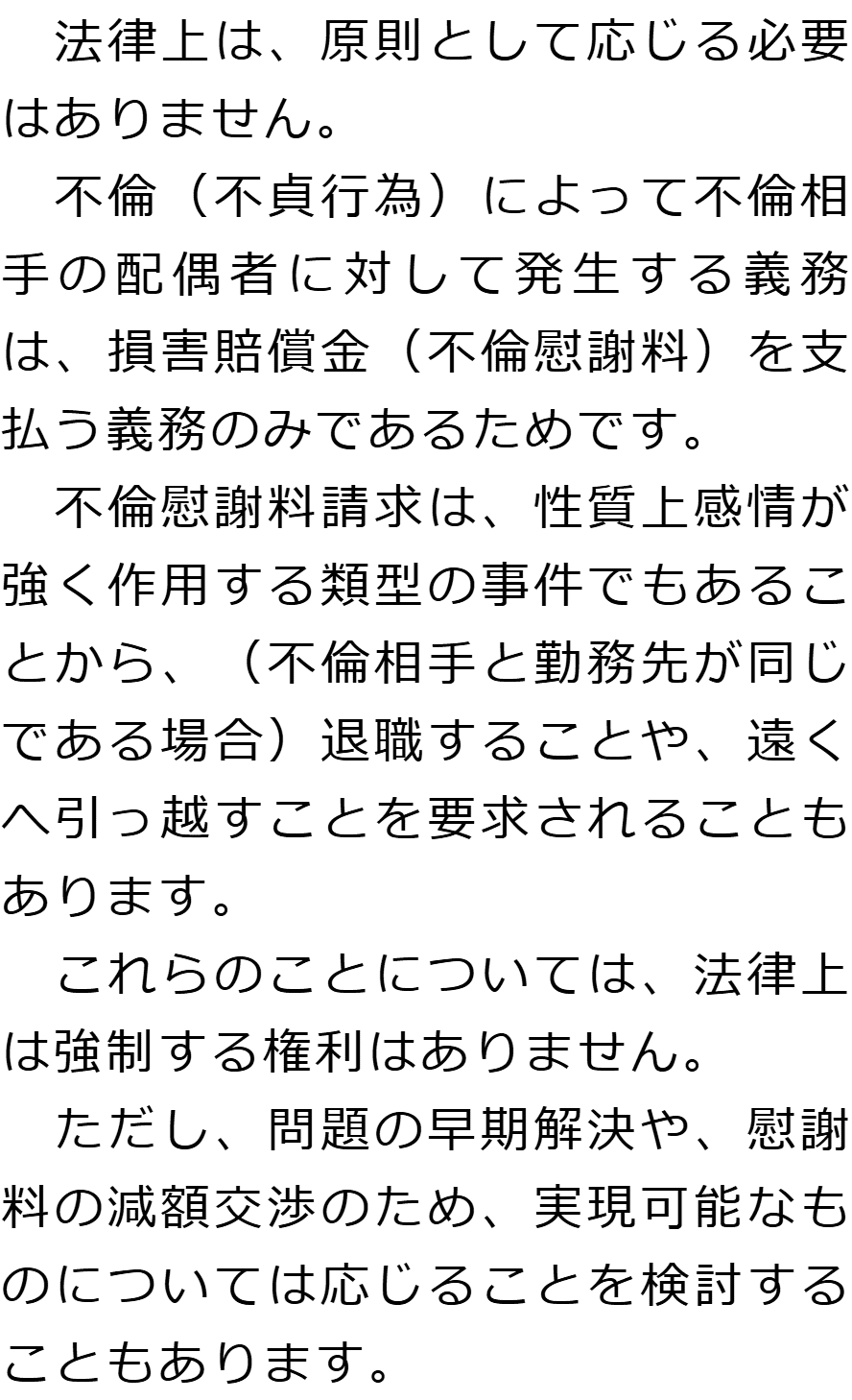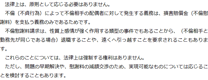 Q金銭以外の賠償を要求されていますが、応じなければいけないのでしょうか?AQ慰謝料を請求されていることが周囲にバレる可能性はありますか?A お役立ち情報・Q&A(目次)お役立ち情報・Q&Aトップお役立ち情報不貞の慰謝料請求をされた場合にやってはいけないことQ&A不倫相手の配偶者から慰謝料を請求された場合のQ&A 受付時間 平日 9時~21時、土日祝 9時~18時夜間・土日祝の相談も対応します(要予約) 所在地 〒111-1111 ●町●●建物● (●弁護士会●所属) 0120-41-2403 お問合せ・アクセス・地図
