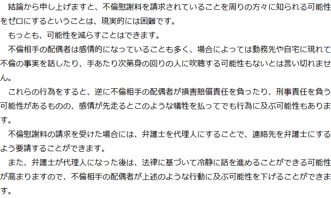 Q慰謝料を請求されていることが周囲にバレる可能性はありますか?A お役立ち情報・Q&A(目次)お役立ち情報・Q&Aトップお役立ち情報不貞の慰謝料請求をされた場合にやってはいけないことQ&A不倫相手の配偶者から慰謝料を請求された場合のQ&A 受付時間 平日 9時~21時、土日祝 9時~18時夜間・土日祝の相談も対応します(要予約) 所在地 〒111-1111 ●町●●建物● (●弁護士会●所属) 0120-41-2403 お問合せ・アクセス・地図