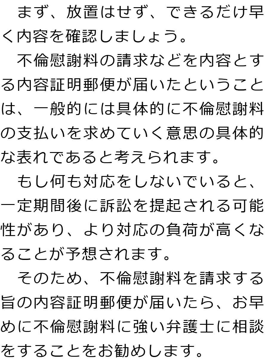 不倫相手の配偶者から慰謝料を請求された場合のQ&AQ内容証明郵便が届いたのですが、どうすればいいですか?Q金銭以外の賠償を要求されていますが、応じなければいけないのでしょうか?Q慰謝料を請求されていることが周囲にバレる可能性はありますか? Q内容証明郵便が届いたのですが、どうすればいいですか?AQ金銭以外の賠償を要求されていますが、応じなければいけないのでしょうか?AQ慰謝料を請求されていることが周囲にバレる可能性はありますか?A お役立ち情報・Q&A(目次)お役立ち情報・Q&Aトップお役立ち情報不貞の慰謝料請求をされた場合にやってはいけないことQ&A不倫相手の配偶者から慰謝料を請求された場合のQ&A 受付時間 平日 9時~21時、土日祝 9時~18時夜間・土日祝の相談も対応します(要予約) 所在地 〒111-1111 ●町●●建物● (●弁護士会●所属) 0120-41-2403 お問合せ・アクセス・地図